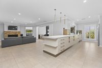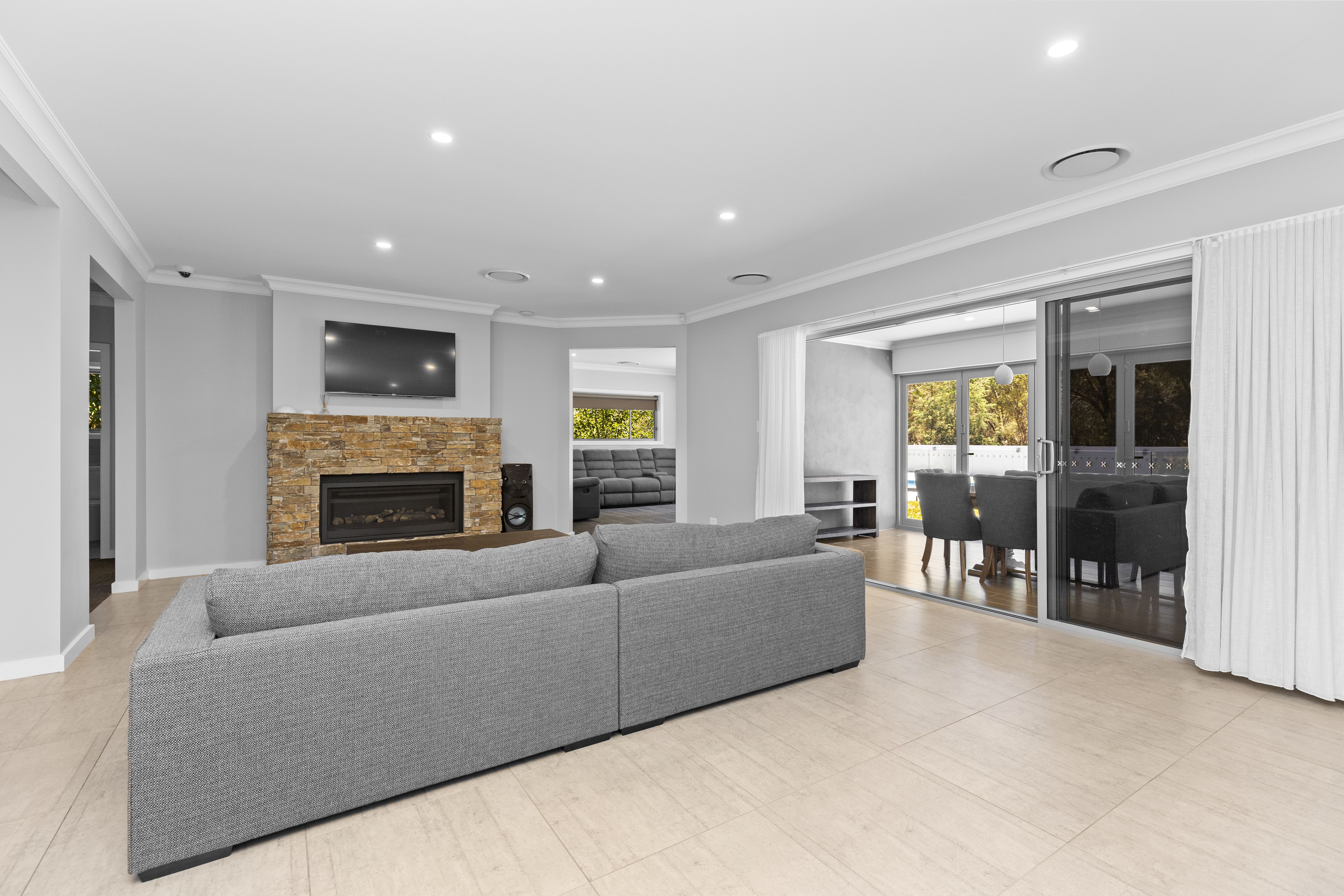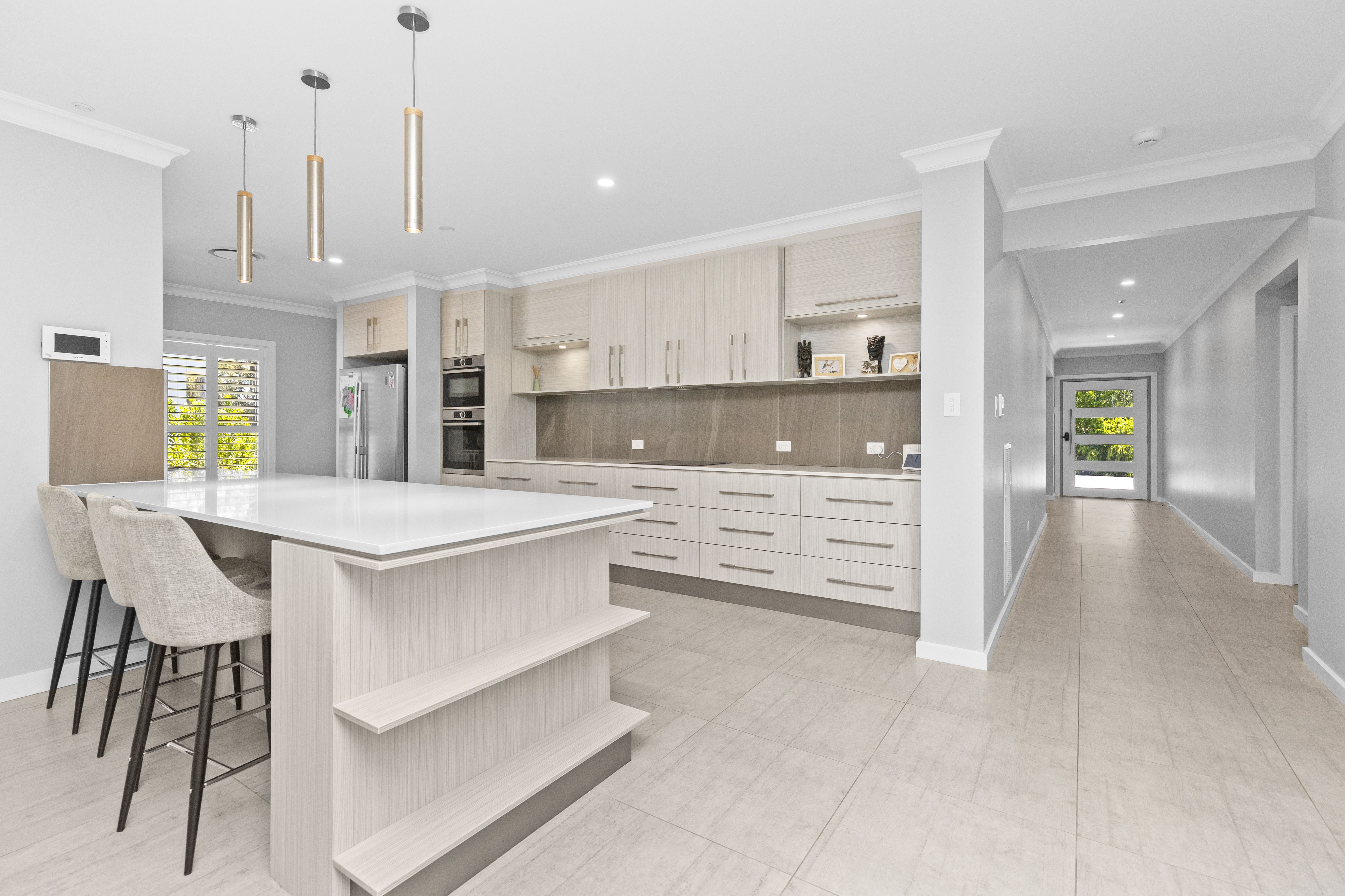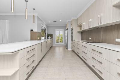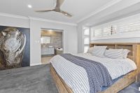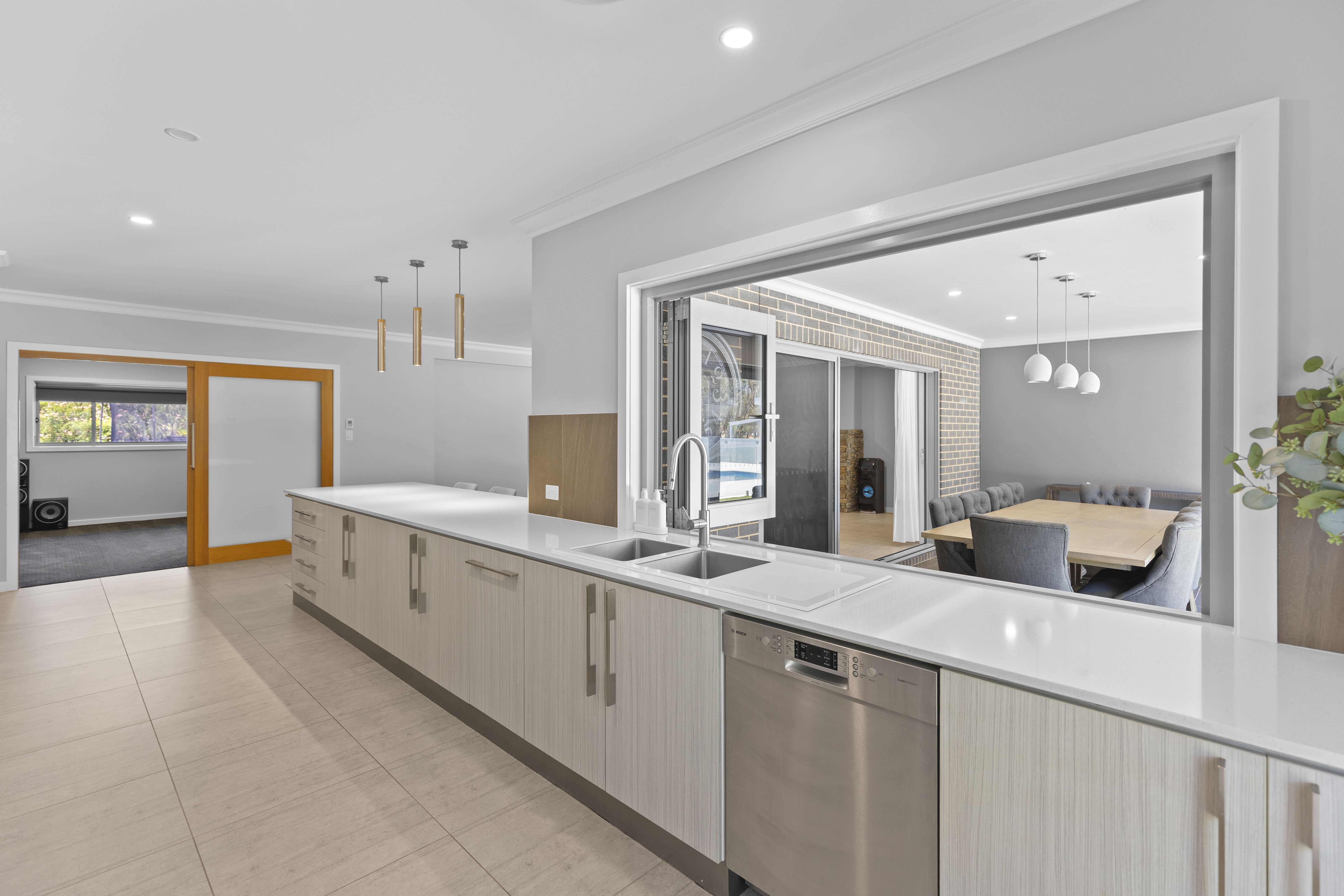 The oversized master wing includes a huge walk-in robe with custom joinery and an ensuite featuring a bath, double vanity, and separate toilet. A wide hallway flows into a light-filled, north-facing dining and casual living space. The adjoining kitchen showcases stone benchtops, clever cabinetry, and a full butler's pantry. Servery windows open onto the entertaining area, complemented by bifold glass doors for year-round use in all weather conditions.