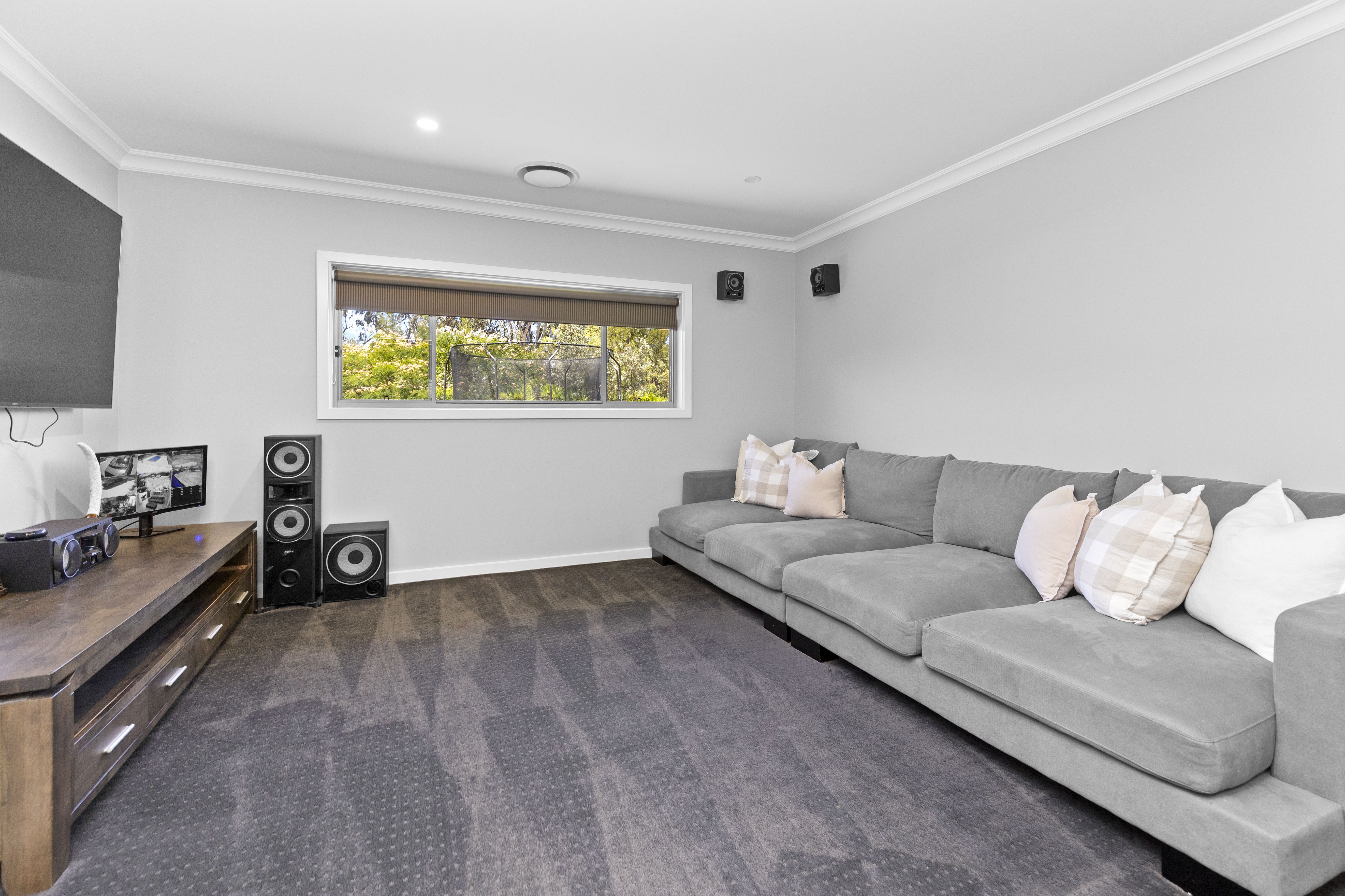 Two additional living spaces, a theatre room and formal lounge are thoughtfully positioned for functionality. The remaining three bedrooms are located in a separate wing, all generously sized with built-ins and a well-appointed bathroom with a separate toilet. The floor plan also includes a full-size office, which could easily serve as a fifth bedroom.