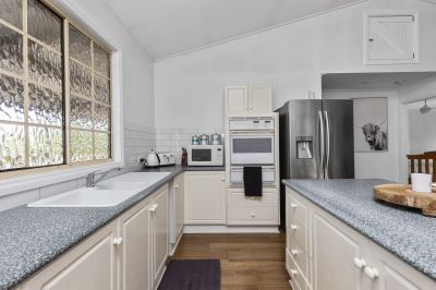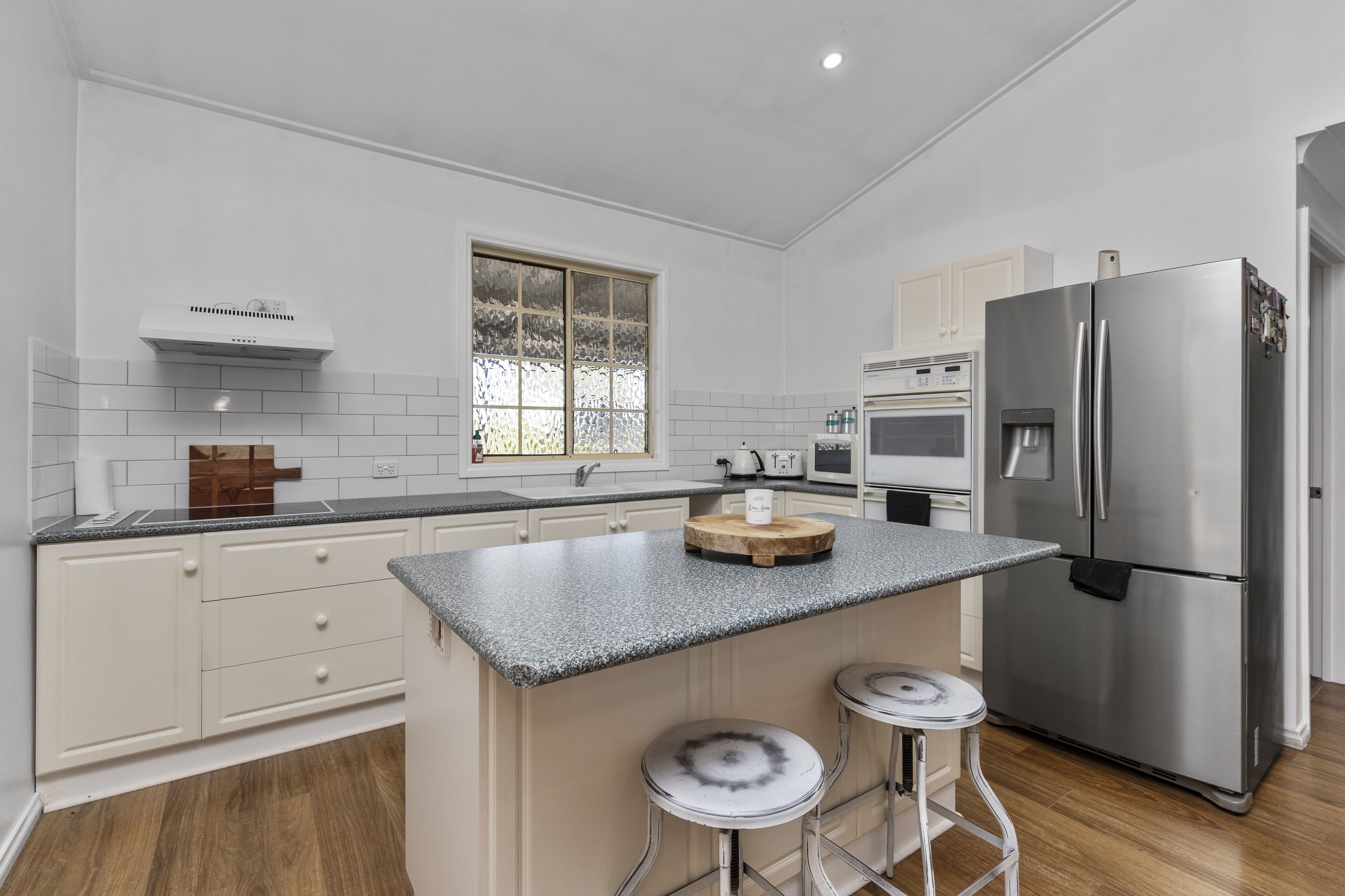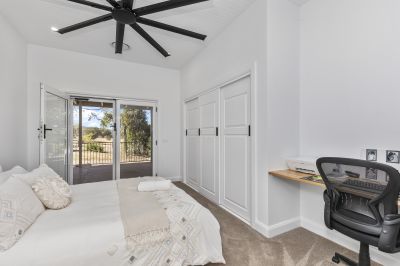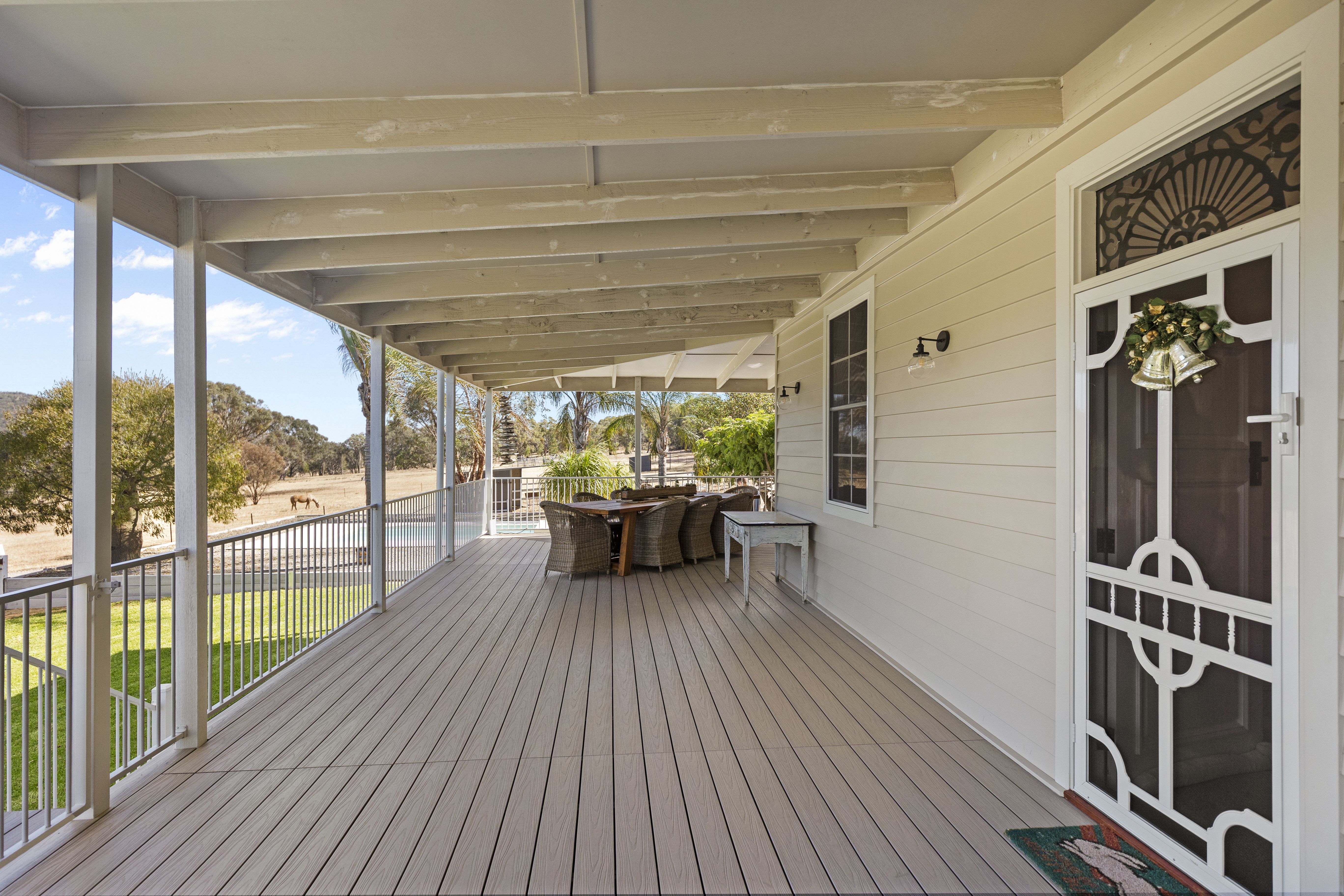 The fully renovated home embraces spacious open plan living, four double bedrooms with three bedrooms opening to wrap-around verandahs, all complete with decorative 2-metre ceiling fans. Ensuite and walk in robe to main. The large country style kitchen is a must see with double ovens, gas hotplates, concrete benchtops, and full length East facing windows for extra morning sunlight.