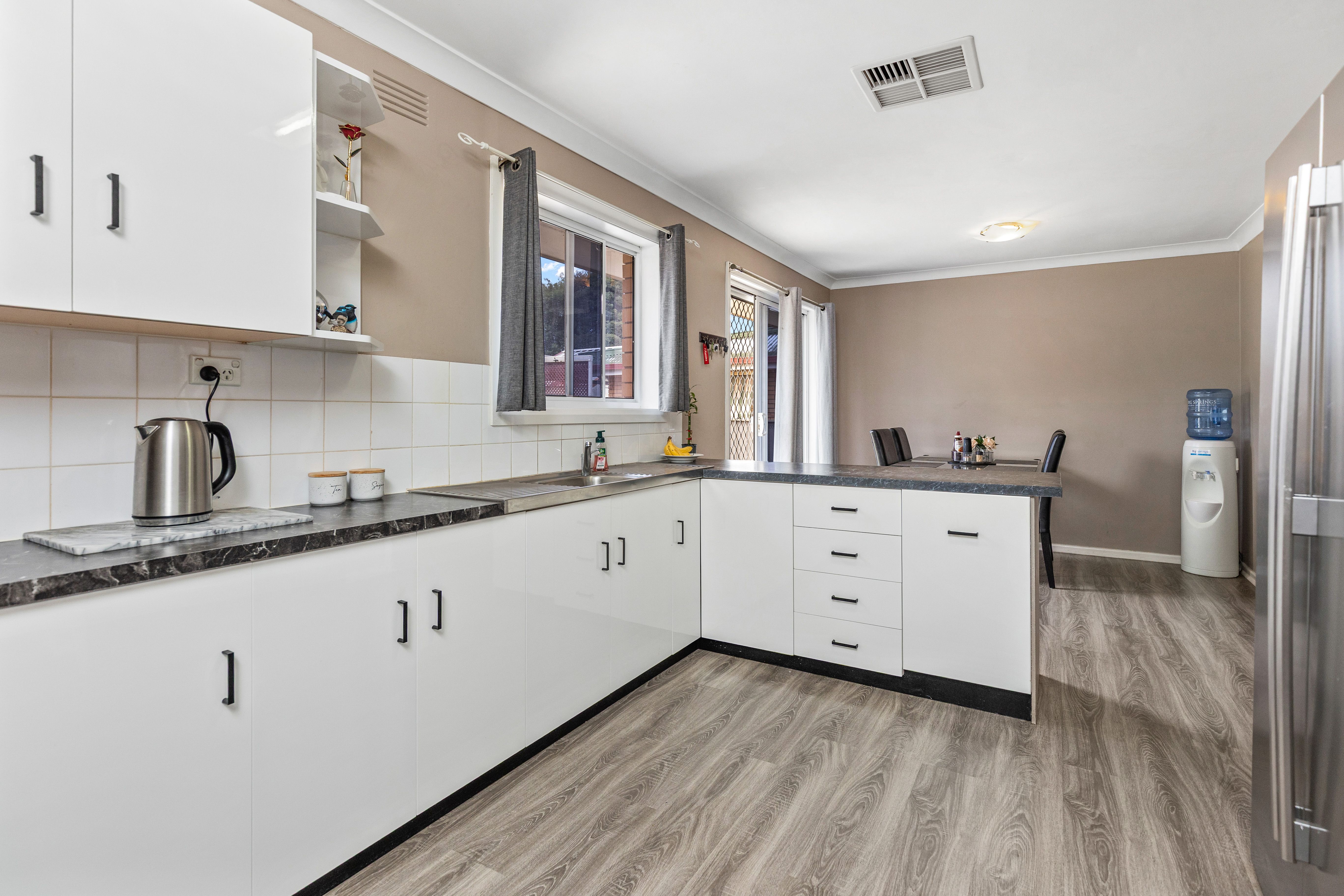 The well-appointed kitchen is centrally positioned, creating an easy flow between living and dining areas. Each of the three bedrooms is generously sized, filled with natural light, and designed for comfortable everyday living. The bathroom is neat and practical, servicing the home with ease.